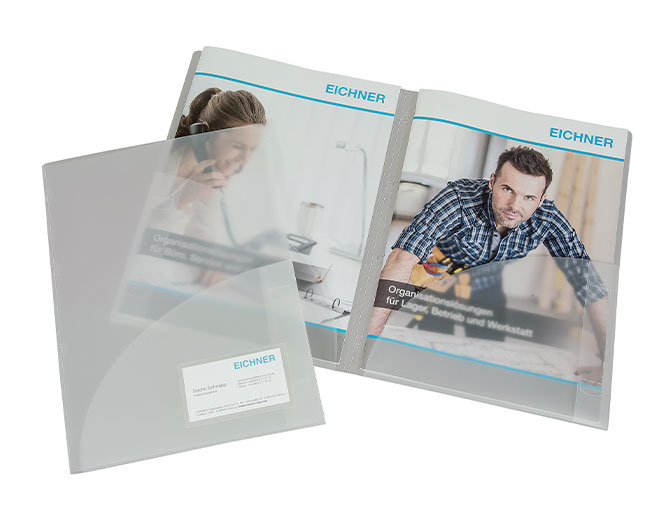Stabile Präsentationsmappe aus umweltfreundlichem Polypropylen inkl. selbstklebender Visitenkartentasche. Die integrierten Innentaschen sichern die Dokumente gegen Herausfallen. Herausklappbare Abheftlaschen im Rücken ermöglichen die Ablage in Ringbüchern und Ordnern.